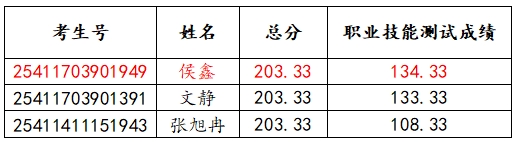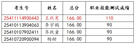 部分专业在录取过程中出现同分情况,按照我校招生章程规定,总成绩相同的情况下,按职业技能测试成绩、文化素质考试成绩(高中学业水平考试成绩或中职文化素质考试成绩、语文成绩、数学成绩、外语成绩)进行依次排序。现将详情公示如下: